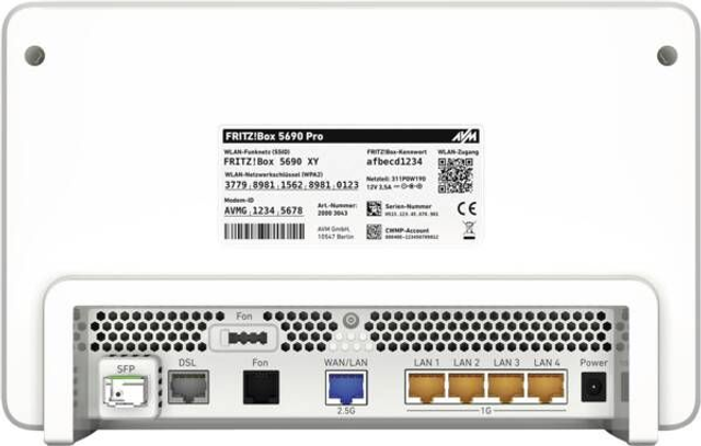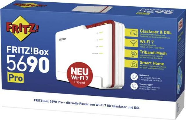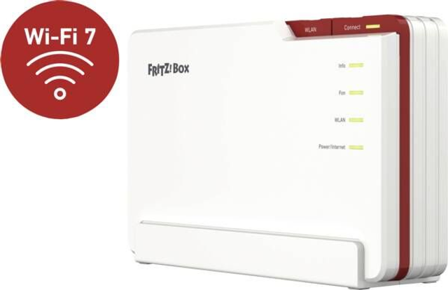 Modem/Router/TK, extern, Analog, ADSL 2+, AON (Active Optical Netzwork), DECT, DSL, GPON (Gigabit Passive Optical Network), VDSL, Supervectoring 35b für Internetgeschwindigkeiten von bis zu 300Mbit/s), per App steuerbar, Datenübertragung W-LAN Mesh, W-LAN, W-Lan 802.11 a, W-Lan 802.11 g, W-Lan 802.11 n, W-Lan 802.11 ac, W-Lan 802.11 ax, W-Lan 802.11 be, WiFi 6, WiFi 6E, WiFi 7, Tri-Band-Betrieb, Datentransferrate W-Lan maximal 18.500 MBit/Sekunde, Schnittstellen Glasfaseranschluss, Anschlüsse 4 x Ethernet RJ45 LAN, 1 x Ethernet RJ45 LAN/WAN, 1 x Anschluss für Analoge Telefone, Anrufbeantworter, Fax, 1 x USB 3.1 Typ A (Gen. 1), DLNA-Server, Media-Server
