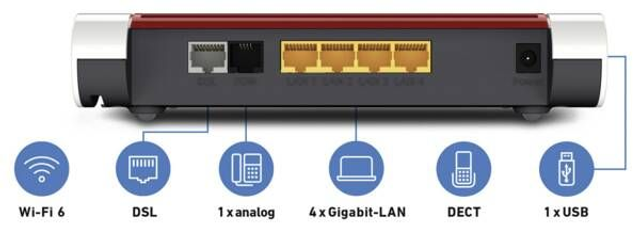 Modem/Router/TK, extern, ADSL, ADSL 2+, DECT, VDSL, VDSL2, VDSL2+, Supervectoring 35b für Internetgeschwindigkeiten von bis zu 300Mbit/s), per App steuerbar, Datenübertragung W-LAN Mesh, W-LAN, W-Lan 802.11 a, W-Lan 802.11 b, W-Lan 802.11 g, W-Lan 802.11 n, W-Lan 802.11 ac, W-Lan 802.11 ax, Dual-Band-Betrieb, DLNA, Datentransferrate W-Lan maximal 2.400 MBit/Sekunde, Datentransferrate Ethernet maximal 1.000 MBit/Sekunde, Schnittstellen 1 x DSL/Tel.-Port, Anschlüsse 4 x Ethernet RJ45 LAN, 1 x Anschluss für Analoge Telefone, Anrufbeantworter, Fax, 1 x USB 2.0, Media-Server