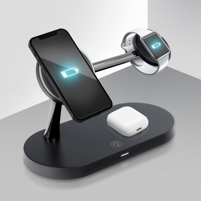 Laden Sie mehr Geräte mit einem Zubehörteil! Mit dem Ladegerät können Sie mehrere Gerätetypen gleichzeitig induktiv laden: Mobiltelefone, TWS-Sets (inkl. Airpods) und Apple iWatch. Kompatibel mit der iPhone 12-Serie.
